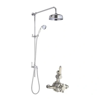 ManoManoGeneral description The Traditional Twin Exposed Valve & Rigid Riser Shower Set in Chrome/White by Balterley is crafted from high-quality brass, featuring a stunning chrome finish complemented by white details on the handles and indices. Its elegant traditional design makes it a perfect addition to any classic bathroom, allowing you to create a sophisticated shower experience. Technical specifications Material: High quality brass Finish: Chrome with white details Type: Twin exposed valve with crosshead & lever handles Temperature control: Thermostatic Manufacturer's guarantee: 5 Years Other information Matching traditional brassware available from Balterley for a consistent bathroom design.