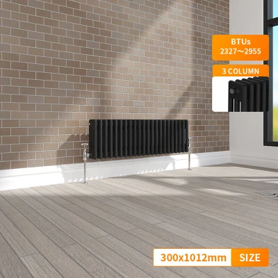 General description Our NRG Traditional Vintage Cast Iron Style Radiator offers a heating solution that combines a classic design with modern functionality at a competitive price. Specially tested, this radiator helps you maximize your available space while easily integrating into your central heating system without complicated installation. Technical specifications Material: 1.5mm Cast Iron style SPCC Steel Size: 300 x 1012 mm Panel: Triple Column Water inlet/outlet size: 1/2" Finish: Black High heat output Tested to BS EN442 standards Other information Brackets and fixings included (valves not included) 15-year guarantee