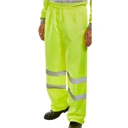 Heavyweight PVC coated polyester Elasticated waist 2 position stud adjustment to legs 2 x Side pockets with storm flaps Fully taped seams Retro-reflective tape EN ISO 20471 Class 1 high visibility EN 343 Class 3 resistance to water penetration Class 1 breathability