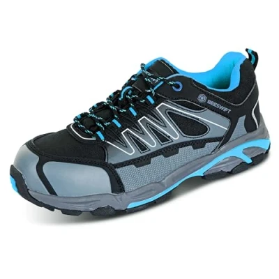 These waterproof safety trainers have nubuck leather mixed with PU and a black action mesh outer design. The outsole is created with EVA/TPU rubber, making it super lightweight. The trainers have been lined with a removable inner sole and a breathable blue mesh lining. Workplace safety equipment has been tried and tested with all measures of safety. These trainers have a 200 Joule composite Using composites in personal protective equipment. Have many features they are durable and have less fracture toughness than other metal toe trainers but are more than most polymer work trainers. Their high dimensional stability allows them to maintain their shape, during hot or cold weather in wet or dry conditions. These safety PPE composite toe cap trainers are made from a strong non-metal material such as either carbon fibre, plastic, or fibreglass. Because these workwear trainers have no metal, composite-toe caps are great for all work sites that use metal detectors and other trades where metal can pose an issue. They also offer better resistance, making them a popular choice for electricians, engineers and construction workers. The trainers are made with an EVA (Ethyl Vinyl Acetate) sole which is a foam material, very similar to rubber. It has natural elasticity and flexibility. They combine TPU (Thermoplastic Polyurethane) which has great resistance and can mould to any area—commonly used in the safety footwear industry.