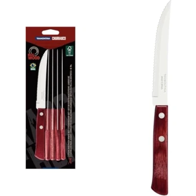 6 PIECE SET: 5” Steak knives with super sharp, serrated AISI 420 stainless steel blades. Each knife measures: length 21.2 cm x width 1.9 cm x height 1 cm DISHWASHER SAFE: Made from polywood (real wood) with a treatment which makes it dishwasher safe and highly durable. BBQ set ideal for daily use, your weekend barbecue at home or camping trips POLYWOOD (REAL WOOD) HANDLE: Sourced from FSC certified forests, impact and high temperature resistant with a 5 year warranty against manufacturing defects MADE IN BRAZIL: Ideal steak knife set for barbecues and outdoor cooking, thermally treated for maximum durability. CHURRASCO COLLECTION: A comprehensive range of steak knives and other essentials for enjoying authentic barbecues. The ideal BBQ gifts!