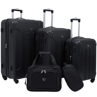 5 piece set includes 28" Large check-in suitcase, 24" Medium check-in suitcase, 20" Carry on, 15" Boarding tote, and 10" Travel accessory kit toiletry bag Luggage Expands for extra packing space Luggage has 4 spinner wheels for improved and smooth mobility that's easy on the wrist when traveling Luggage material: ABS hard-shell that's light yet durable 15" Boarding tote features a back strap that can attach onto luggage trolleys