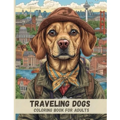 Traveling Dogs Coloring Book for Adults: Adorable Explorer Dogs, Scenic City Views, and Relaxing Black & White Pages