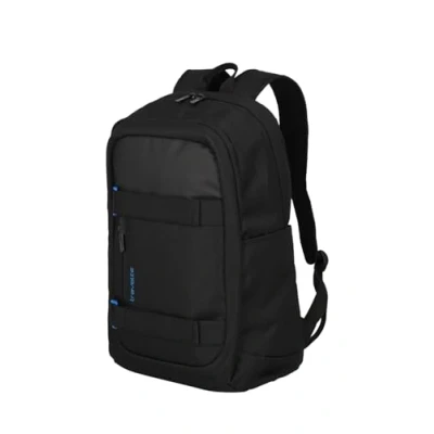 PATHWAY: Durable. Completely recycled. And extremely functional. Whether you're taking your skateboard into the city, to work, to university or on a short trip: the PATHWAY backpack is always the right choice EQUIPMENT: Jackets, skateboards, etc. can be easily attached to the front with the two outer Velcro straps. A lightly padded 17" laptop compartment and a tablet compartment offer sufficient space and protection for electronic devices. Everything else fits into the two main compartments, the small front pocket or the two side pockets PRACTICAL: The back panel is padded, as are the adjustable shoulder straps. An adjustable chest strap increases carrying comfort. With the practical clip-on function, the rucksack can be conveniently attached to the handle of a trolley SCOPE OF DELIVERY: 1 x travel backpack hand luggage aircraft; dimensions 48 x 31 x 19 cm (complies with IATA standard board luggage dimensions); volume 28 litres; weight 0.6 kg; colour: black TRAVELITE: The Hamburg-based family business has been providing travellers with lightweight, robust and functional travel and leisure luggage since 1949