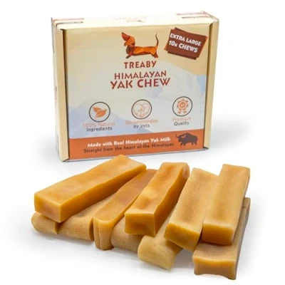 NATURAL DENTAL HEALTH - Treaby Himalayan Yak Chews are more than just a healthy tasty treat - they're a powerhouse of dental care. Free from gluten, additives, and preservatives, these 100% natural chews clean and fortify teeth, combating plaque and tartar buildup for dogs, puppies and older seniors of all sizes. PROTEIN PACKED GOODNESS - Loaded with protein and calcium, our durable Yak dental sticks for dogs contribute to healthy teeth and bones, making them an ideal protein bar alternative for dogs of all ages. Give your dog the nutrition they need with every satisfying chew with our natural puppy chews. LONG LASTING & ENGAGING - Keep your new pup or reliable furry friend entertained for hours with the irresistible taste and aroma of our Treaby Yak Chews for dogs large, medium, small or extra large in size. Designed to last several days to a week for moderate chewers, our natural chewy dog treats provide a long-lasting solution to keep your dog busy while you attend to your daily tasks, the perfect stress reliever to keep them calm. SUSTAINABLE ECO FRIENDLY TREAT - Our commitment to sustainability doesn't end with the chew. After your dog has enjoyed their Himalayan Yak Chew, microwave the remaining bits into a delicious cheesy puff, leaving no waste behind for a healthy, eco-conscious snacking experience that both you and your dog will love. So, choose Treaby Natural Himalayan Yak for dogs and puppies for a happy, contented partnership! TRUSTED UK BRAND – Treaby, a family-owned brand, prioritises your pets' health with 100% natural, sustainably sourced, and hypoallergenic chews and supplements. With our unwavering commitment to quality, you can trust that your canine friends, cats, and other pets receive the utmost care, promoting their overall well-being. Join us for a healthier, happier life for your treasured companion!