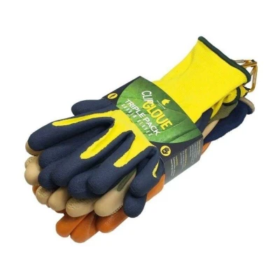 General description Three gardening gloves in one pack, perfect for general gardening tasks. This pack will cover all your gardening needs and includes an aluminium carabiner clip that can be attached to your belt or garden bag. Technical specifications Includes three pairs of gloves: Extra fine polyester gloves with honeycomb textured latex coating for extra grip Polyester gloves with foam latex coating Polyester gloves with smooth nitrile coating Available sizes: Medium (9cm/3.54") and Large (10cm/3.94") Usage To find the right size, measure the width of your four fingers when held together.