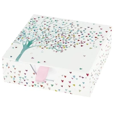 Beautiful designer box keeps its matching memo sheets -- for notes, reminders, ideas, and more -- at your fingertips! Desk Notes set contains 250 note sheets. Delicate design features a fanciful tree with tiny multi-colored heart ''leaves'' and eye-catching touches of silver foil. Ribbon tab adds a touch of elegance. Magnetic closure secures your note set. Hearts design is replicated on the corners of each note sheet. Desk Notes set complements home and office work spaces.