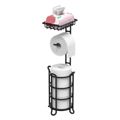 Chic Matte Black Finish: Adds a modern and stylish touch to your bathroom. Ample Storage: Holds up to four spare mega rolls. Versatile Shelf: Perfect for placing a phone, wipes, or small items. Sturdy Build: High-quality metal construction ensures stability. Hassle-Free Assembly: Quick and easy to set up without tools.