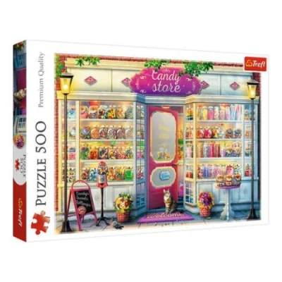 Challenge yourself at home with the Trefl Candy Store Puzzle, perfect for spending time with friends and family. Featuring a stunning design of a candy store front with all the sweets on display and a tabby cat sat on the doorstep. This 500 piece puzzle is a great gift for anyone you know who loves puzzles.. Trefl Candy Store Puzzle. 500 Pieces. Ages 10+. Great gift idea. When complete measures 48 x 34cm