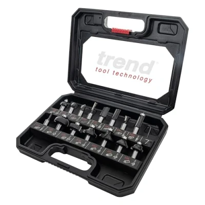 ManoManoGeneral description Trend SET/SS9TC 15 Piece Router Bit Starter Set includes a variety of popular 1/2in tungsten carbide tipped cutters suitable for multiple applications. This set is ideal for working with softwood, hardwood, chipboard, plywood, and MDF. It comes conveniently packaged in a plastic carry case. Technical specifications Number of pieces: 15 Shank size: 1/2in Type: Tungsten carbide tipped Includes: 1 x Single Flute (4.8 x 11mm), 3 x Two Flute (6.3 x 19mm, 12.7 x 25mm, 19 x 25mm), 1 x Dovetail (12.7mm), 2 x Guided Round Over (R9.5mm, R12.7mm), 1 x Guided Chamfer (45°), 1 x Guided Roman Ogee (R4mm), 1 x Guided Trimmer (12.7mm), 2 x Guided Cove (R6.3mm, R12.7mm), 1 x V-Groove (45°), 1 x Core Box (R6.35mm), 1 x Guided Rebater (Rebate 11.1mm) Other information MPN: TRESETSS9TC EAN: 5027654034767