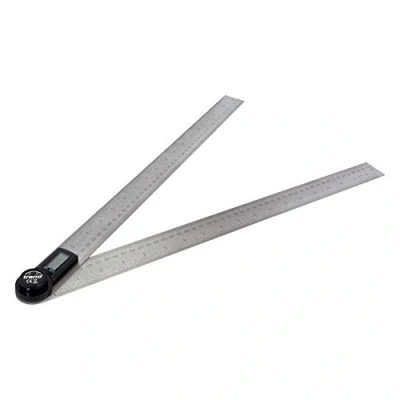 General description This digital angle rule features two stainless steel rulers, each 18.5 inches (500mm) long, designed for quick and precise angle measurements. It is ideal for woodworking, construction, and machining tasks. The device provides an easy-to-read digital display for measuring angles from 0° to 360°, with a resolution of 0.1° and an accuracy of ±0.3°. It includes a locking function to fix measurements and automatically powers off after 6 minutes of inactivity for battery conservation. Technical specifications Measuring range: 0° to 360° Resolution: 0.1° Accuracy: ±0.3° Material: Stainless steel Scale: Metric and imperial Length: 18.5 inches (500mm) Weight: Approximately 360g Power: CR2032 lithium battery (included) Automatic shut-off: After 6 minutes Compatibility and accessories Compatible with standard woodworking, construction, and machining tools Includes 1 digital angle rule and battery Installation No installation required; simply turn on the device and calibrate