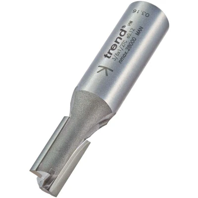 General description This Trend 3/6 x 1/2 TCT Two Flute Cutter is a two-flute tungsten carbide tipped (TCT) straight cutter designed for woodworking and home improvement tasks. It produces a cleaner finish compared to single-flute cutters and is suitable for various routing applications such as grooving, rebating, morticing, drilling, and shallow lateral cuts like recessing hinges. The cutter is compatible with abrasive materials including chipboard, MDF, plywood, hardwoods, and hard plastics, making it ideal for precise and smooth cuts in both DIY and professional projects. Technical specifications Cutting Diameter: 10mm (25/64 inch) Cutting Length (C): 19mm Overall Length (OL): 63mm Shank Diameter: 1/2 inch Material: Tungsten carbide tipped Compatibility and accessories Compatible with standard 1/2 inch collet routers and drill machines Suitable for use with router bits and collets designed for 1/2 inch shank Installation Ensure the router or drill is unplugged before installation