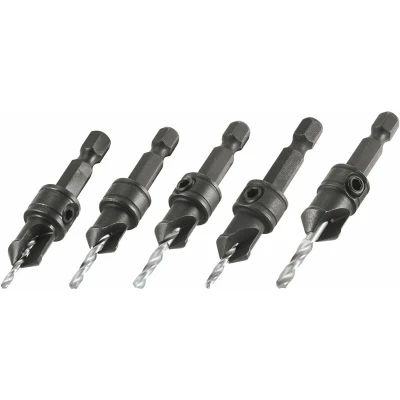 General description Trend QR/CS/SET Quick Release 5 Piece Countersink Drill Bit Set features a quick release 1/4 inch hex shank designed for use in quick tool change drills. This set includes five countersink drill bits made from Tool Steel (WS) with High Speed Steel (HSS) drill bits for enhanced durability and longevity. The countersinks ensure that screw heads are sub-flush and neat, making them ideal for various materials including timber, fibre-board, and chipboard. Technical specifications Shank Diameter: 1/4 inch hex Drill Diameter: 2mm to 3.5mm Countersink Diameter: 9.5mm & 12.7mm Softwood Compatibility: No.6 (3.6mm) to No.12 (5.5mm) Hardwood Compatibility: No.4 (3mm) to No.10 (5mm) Usage Ideal for quick chuck drill tools and impact drivers Can be used to counterbore deeper holes for plugs Adjustable drill bit to suit material thickness Other information Includes 1 x 2.0mm (5/64") drill countersink Includes 1 x 2.5mm (3/32") drill countersink Includes 1 x 2.75mm (7/64") drill