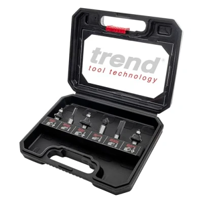 AmazonROUTER BITS FOR VARIOUS MATERIALS: This router bit set is made from quality materials and is perfect for routing softwood, hardwood, chipboard, plywood, and MDF. TOUGH AND DURABLE: The tips of the cutters are made of tungsten carbide (TC), ensuring long-lasting performance and precise cuts. A great addition to your router bit collection. 1/4 INCH SHANK DIAMETER: The 1/4-inch shank size fits all models of routers, providing convenience and flexibility for your smaller woodworking projects. CONVENIENT AND SECURE: The set comes in a hardwearing carry case for simple and safe storage, transport, and organization. 6 PIECE SET INCLUDES: Straight Two Flute 1/4", Straight Two Flute 1/2”, V-Groove 45 Deg, Guided Round Over 1/4”, Guided Round Over 3/8”, Guided Ogee 5/32”., Weight: 0.0881849048 pounds, Manufacturer: Trend