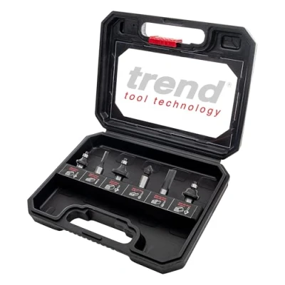 General description The Trend 6 Piece 1/4 Inch Shank Router Bit Set (SET/SS11X1/4TC) is an excellent value starter set designed for both decorative and constructional woodworking. This set includes a variety of popular cutters, making it ideal for those looking to experiment and learn routing techniques without a significant investment. Technical specifications Shank Diameter: 1/4 inch Cutters: 2 Straight Cutters (6.3 x 16mm and 12.7 x 25mm) 1 V-Groove Cutter (45° x 12.7mm) 2 Guided Round Over Cutters (R6.35mm and R9.5mm) 1 Guided Ogee Cutter (R4mm) Compatibility and accessories Suitable for use with softwood, hardwood, chipboard, plywood, and MDF. Supplied in a durable plastic carry case for easy storage and transport. Usage This router bit set is perfect for a variety of woodworking projects, allowing users to create decorative edges and profiles with ease. The solid carbide brazed cutting tips ensure excellent performance and durability, making them suitable for both abrasive