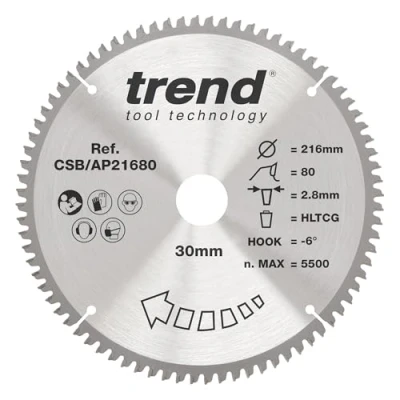 Trend Aluminium & Plastic Circular Saw Blade, 216mm Diameter, 30mm Bore, 80 Teeth, TCT, 2.8mm Kerf, 6 Hook, CSB/AP21680