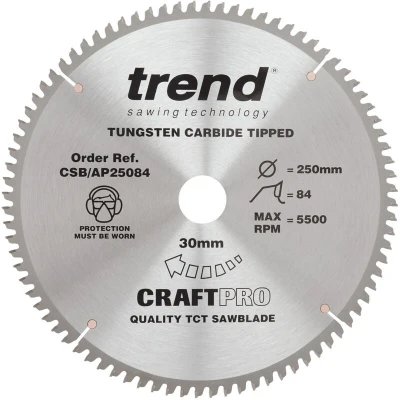 General description The Trend CSB/AP25084 Craft Blade is a specialist saw blade designed for ultra-fine cutting of plastics and alloys. With a -6 degree hook and a 3mm kerf, it ensures clean and safe cuts, making it ideal for use with mitre and table saws. The blade features TCP (Triple Chip Profile) tungsten carbide tips for professional finishes and is suitable for cutting aluminium and UPVC window components. Technical specifications Diameter: 250 mm (10 inches) Bore: 30 mm Kerf: 3.0 mm Plate thickness: 2.0 mm Number of teeth: 84 Tooth form: TCP Hook angle: -6 degrees Compatibility and accessories Supplied with 16mm, 20mm, and 25.4mm bushing washers for compatibility with a range of saws. Usage For alloy cutting, use a cutting lubricant such as Trendiwax. Wear gloves and clamp material securely during use. Other information Laser etched on reverse to European standard EN847-1/2. Silver brazed tips ensure secure bonding to the body. Body is hardened and tempered to maintain trueness