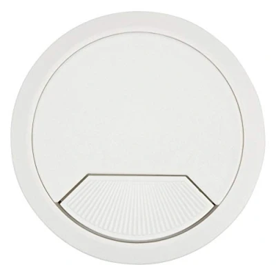 ManoManoGeneral description Two-part ABS plastic inserts designed for the neat organization of computer, telephone, and audio cables through desktops, cabinets, and shelving units. The inserts come in light grey and feature a spring-loaded swivel cover plate for easy access. Technical specifications Material: ABS plastic Insert sizes: 60mm and 80mm Includes: 1 x Circular insert Usage Ideal for tidying up cables in office desks, cabinets, and shelving units. Cover plates can be removed to allow plugs to pass through, facilitating easy connectivity.