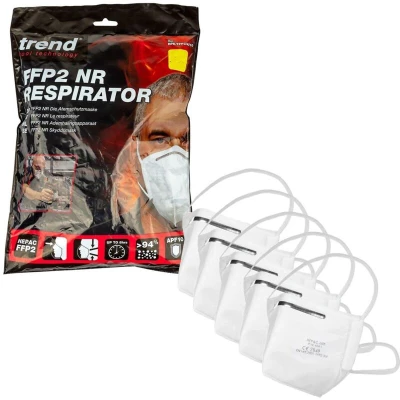 Trend RPE/FFP2/A/5 FFP2 HEPAC Filter Mask 5 Pack Lightweight Fold Flat Ergonomic FFP2 Respirator with HEPAC Filtration for protection against fine nuisance dust particles FPP2 Filtration - For Softwood Dust, sheet materials, (not MDF or hardwood) Fibreglass HEPAC Filtration High Efficiency Particulate Air Composite - For enhanced particulate capture Efficiency Above 94% Dust Capture Efficiency - For increased respiratory protection Maximum Filtration Area - Entire surface area of the mask is the filter for highly efficient capture and easier breathing Comfort Fit - Adjustable nose clip for comfortable fit and tighter nose seal Day Long Protection - Can be used for up to 8 hours Adjustable straps elasticated adjustable straps for better fit and increased comfort Lightweight weighs only 9 grams for day long comfort Fold Flat Design easily slips into a pocket when not required Assigned Protection Factor APF10 x WEL Maximum usage level up to 10 x WEL 5 x FFP2 mask