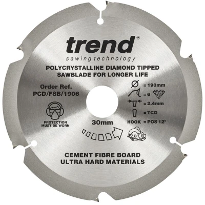 Trend PCD Fibre Cement Circular Saw Blade, 190mm Diameter, 30mm Bore, 6 Teeth, 2.4mm Kerf, +12 Hook, PCD/FSB/1906