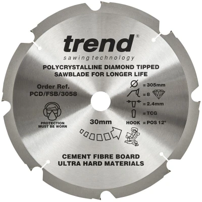 Trend PCD Fibre Cement Circular Saw Blade, 305mm Diameter, 30mm Bore, 8 Teeth, 2.4mm Kerf, +12 Hook, PCD/FSB/3058