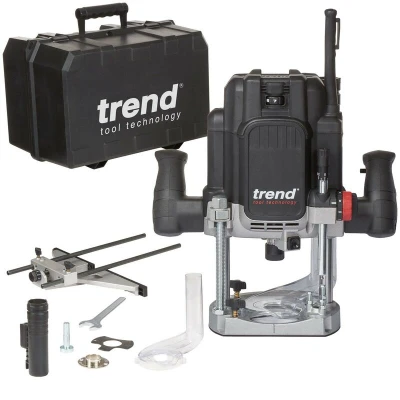 General description The Trend T12EK Variable Speed Router is a high-performance plunge router designed for trade professionals. It features advanced safety mechanisms and is engineered for reliable, fast, and accurate cuts. With a powerful 2300W motor, this router delivers high power, torque, and speed, while its soft-start function helps prevent kick-back during operation. The router is equipped with a 7-level variable speed control, allowing users to adapt to various cutters, materials, and applications. Technical specifications Input Power: 2300W No Load Speed: 9,000-22,000/min Plunge Stroke: 0-80mm Cutter Diameter: 50mm (handheld) Guide Bush Ø: 30mm Dust Spout Size ID: 35mm Rod Ø x Length: 10 x 360mm Rod Centres: 100mm Base Aperture Size: 70mm Weight: 6.4kg Compatibility and accessories Standard Collet Diameter: 1/2in Supplied with: 1 x Side Fence, 1 x Guide Bush Plate, 1 x Collet, 1 x Guide Bush Pin, 1 x Top-mount Extraction Adaptor, 1 x 30mm Guide Bush, 1 x Cyclone Dust Adaptor,