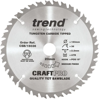 General description Trend CSB/16036 Craft saw blade is designed for a professional finish in various materials including particle board, veneered boards, plywood, MDF, chipboard, laminated surfaces, veneer, and hardboard. Technical specifications Diameter: 160mm Teeth: 36 Bore: 20mm Material: High grade alloy steel plate Laser etched on reverse to European standard EN847-1/2 Compatibility and accessories Compatible with Festool TS55 Compatible with Scheppach PL55 Compatible with Scheppach CS55 Other information Reamed bore ensures precise fit to spindle Silverbraze technology secures the tip to the body Body is hardened and tempered to maintain trueness Trend name provides traceability and quality guarantee