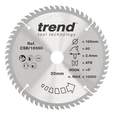 VERSATILE CUTTING PERFORMANCE: Effortlessly cuts softwood, hardwood, plywood, MDF, and hardboard, delivering smooth, accurate results for furniture making, cabinetry, flooring, and other woodworking projects. SUPERIOR CUT ACCURACY: ATB tooth design enhances precision, delivering smooth, clean cuts with minimal tear-out for consistently professional results. CIRCULAR SAW COMPATIBLE: High-performance replacement blade designed for easy installation, precise cutting accuracy, and seamless compatibility with a wide range of circular saw models. EXCEPTIONAL DURABILITY & SHARPNESS: Premium microgranular tungsten carbide tips maintain sharpness longer, reducing replacements and ensuring consistent cutting performance over time. ENHANCED SAFETY & STABILITY: Heat-dissipating expansion slots minimise vibration and prevent overheating, improving control and safety for smooth, reliable operation. COMPATIBLE SAWS: Fits Bosch Pro GKS 55+ G, GKS 55+ GCE, GKS 165, GKT 55 GCE, Dewalt DWE550, DWS520, Einhell TE-PS 165, Evolution F165CCSL, R165CCSL, Makita HS6601, SP6000, and many more, Weight: 0.6834330122 Pounds, Manufacturer: Trend