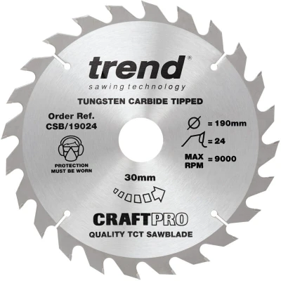 Trend Wood Circular Saw Blade, 190mm Diameter, 30mm Bore, 24 Teeth, TCT, 2.6mm Kerf, +15 Hook, CSB/19024