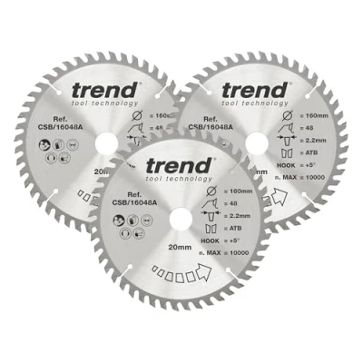 ManoManoGeneral description This pack includes three Trend CSB/16048A CraftPro plunge saw blades, each measuring 160mm in diameter, featuring a 20mm bore and 48 teeth. These high-quality blades are designed to provide a professional finish in particleboard, plywood, MDF, and hardboard, making them ideal for various woodworking and home improvement projects. Technical specifications Diameter: 160mm Bore diameter: 20mm Number of teeth: 48 Kerf: 2.2mm Plate thickness: 1.6mm Tooth form: ATB Hook angle: 15° Part number: CSB/160/3PK Compatibility and accessories Compatible with plunge saws that accept 160mm blades with a 20mm bore Suitable for cutting wood and similar materials Installation Ensure the saw is unplugged before installation Align the blade with the saw's arbor and secure it tightly using the appropriate tools Usage Use for precise plunge cuts in woodworking projects Operate at recommended speeds and follow safety guidelines