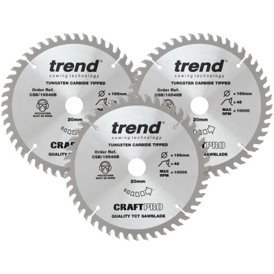 General description This pack includes three Trend CraftPro CSB/16548B Plunge Saw Blades, designed for professional finishing in various materials such as particleboard, plywood, MDF, and hardboard. They provide precise and clean cuts, making them ideal for woodworking and construction projects. Technical specifications Diameter: 165 mm Bore: 20 mm Kerf: 2.2 mm Plate Thickness: 1.6 mm Tooth Count: 48 Tooth Form: ATB Hook Angle: 15° Pack Quantity: 3 blades Compatibility and accessories Compatible with plunge saws and similar power tools that accept 165 mm blades with a 20 mm arbor Suitable for use with cutting guides and other woodworking accessories Installation Ensure the saw is unplugged before installation Remove the existing blade and align the new blade onto the arbor Secure the blade tightly with the provided nut or locking mechanism Usage Use appropriate safety gear, including goggles and ear protection Follow the manufacturer's instructions for your saw model Operate at