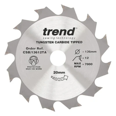 Trend Wood Cordless Circular Saw Blade, 136mm Diameter, 20mm Bore, 12 Teeth, TCT, 1.5mm Kerf, +15 Hook, CSB/13612TA