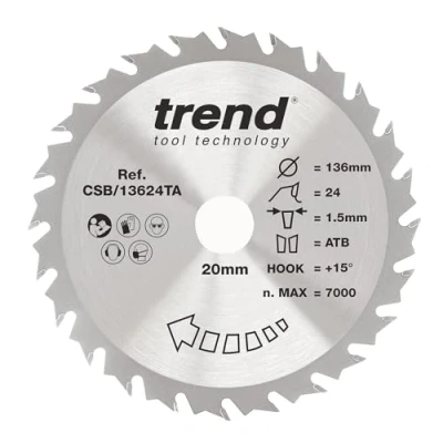 Trend Wood Cordless Circular Saw Blade, 136mm Diameter, 20mm Bore, 24 Teeth, TCT, 1.5mm Kerf, +15 Hook, CSB/13624TA