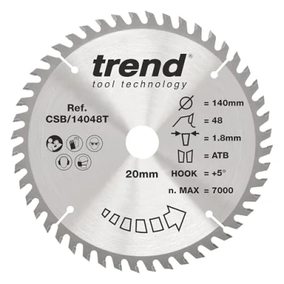 Trend Wood Cordless Circular Saw Blade, 140mm Diameter, 20mm Bore, 48 Teeth, 1.8mm Kerf, +5 Hook, TCT, Fine Finish, CSB/14048T