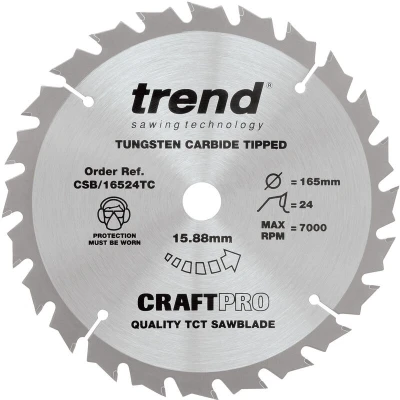 General description The Trend 165mm Craft Saw Blade is designed for cordless circular saws, featuring a 165mm diameter and a 5/8in (15.88mm) bore. With 24 teeth and a thin kerf design, this blade is perfect for general-purpose ripping and crosscut work. Technical specifications Diameter: 165mm Bore: 5/8in (15.88mm) Teeth: 24T Type: Thin Kerf Compatibility and accessories Designed for use with cordless circular saws Not compatible with Bosch GSK 24 Usage Ideal for general-purpose ripping Suitable for crosscut work Other information Premium quality Microgranular Tungsten Carbide tips for high performance and edge retention High grade alloy steel plate body for assured accuracy and longevity