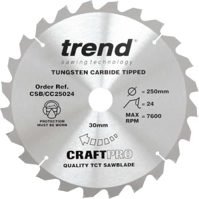 Trend Wood Mitre Saw Blade, 250mm Diameter, 30mm Bore, 24 Teeth, TCT, 3mm Kerf, 5 Hook, CSB/CC25024