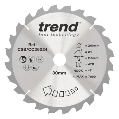 Trend Wood Mitre Saw Blade, 260mm Diameter, 30mm Bore, 24 Teeth, TCT, 2.6mm Kerf, 5 Hook, CSB/CC26024