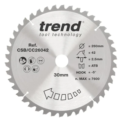 Trend Wood Mitre Saw Blade, 260mm Diameter, 30mm Bore, 42 Teeth, TCT, 2.6mm Kerf, 5 Hook, CSB/CC26042
