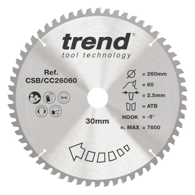 Trend Wood Mitre Saw Blade, 260mm Diameter, 30mm Bore, 60 Teeth, TCT, 2.5mm Kerf, 5 Hook, CSB/CC26060