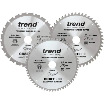 Trend Wood Mitre Saw Blades, 216mm Diameter, 30mm Bore, 24, 48 & 60 Teeth, TCT, 2.6mm Kerf, 5 Hook, CSB/CC216/3PK