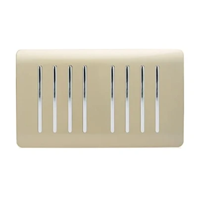 A CHAMPAGNE GOLD 8 GANG LIGHT SWITCH MADE FROM HIGH QUALITY FIREPROOF ABS PLASTIC: From Trendiswitch, screwless plate with a sleek and modern appearance – making decorating a breeze. PART OF THE TRENDISWITCH COLLECTION: The switch faceplate maintains a smooth, gloss surface in gold that will not fade in direct sunlight like some similar products SCREWLESS PLATE WITH NO ADDITIONAL WIRING NEEDED: Makes it easy to clean and install– simply replace the old switch by removing the faceplate and clicking the new one into place SEMI-FLUSH DESIGN FITS IN WITH THE WALL: The rounded corners and style creates a minimalistic yet pleasing to the eye décor that can be switched up with any of our other colours PROTECTION GUARANTEED: TrendiSwitch guarantees a five year warranty period where your switch will be protected against scratches, fading or malfuctioning – so you can feel at ease