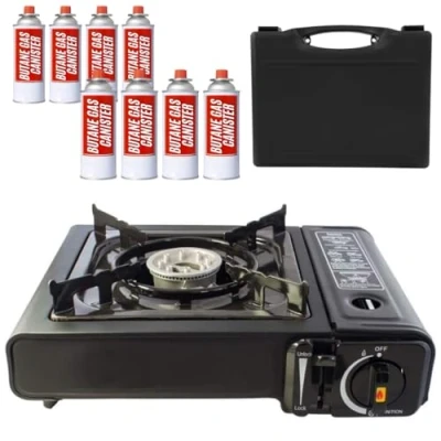 Trendi Portable Camping Stove with 8 Gas Canisters Complete Outdoor Cooking Set Carry Case, EN417 Compatibility, Auto Ignition & Adjustable Flame