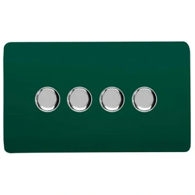 A DARK GREEN 4 GANG DIMMER SWITCH MADE FROM HIGH QUALITY FIREPROOF ABS PLASTIC: From Trendiswitch, screwless plate with a sleek and modern appearance making decorating a breeze. PART OF THE TRENDISWITCH COLLECTION: The dimmer switch faceplate maintains a smooth, polished surface in gloss green that will not fade in direct sunlight like some similar products SCREWLESS PLATE WITH NO ADDITIONAL WIRING NEEDED: Makes it easy to clean and install simply replace the old switch by removing the faceplate and clicking the new one into place SEMI-FLUSH DESIGN FITS IN WITH THE WALL: The rounded corners and style creates a minimalistic yet pleasing to the eye decor that can be switched up with any of our other colours PROTECTION GUARANTEED: TrendiSwitch guarantees a five year warranty period where your switch will be protected against scratches, fading or malfuctioning so you can feel at ease