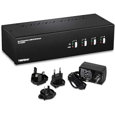 CONTROL FOUR COMPUTERS: This 4-port dual monitor DisplayPort KVM 1.2 KVM switch allows you to control four computers with one set of console controls and is designed for use with dual DisplayPort systems; the KVM switch is designed to connect DisplayPort monitors (recommended for use with DisplayPort monitors and graphic cards with DisplayPort] 4K UHD RESOLUTION: This 4-port KVM switch enables you to experience up to 4K UHD resolutions 3840 x 2160 @ 60 Hz and up to 2560 x 1440 @144 Hz AUDIO SUPPORT: The KVM switch provides full audio support with 3.5 mm microphone and speaker jacks that maximise work station productivity USB 2.0 HUB: The KVM switch is designed with two additional USB ports to connect storage drives and printers between computers REQUIRED CABLING: TRENDnet recommend using this KVM switch with the TRENDnet model number TK-CP06, a 6 ft DisplayPort USB and audio KVM cable kit (sold separately) USB MOUSE AND KEYBOARD: True Transparent USB (TTU) emulation technology supports most keyboard and mouse designs with the KVM switch KVM PORT INTERFACE: Keyboard/Mouse: USB Type B, Monitors: 2 x DisplayPort 1.2, Speaker jack: 3.5 mm, Microphone jack: 3.5 mm CONSOLE PORT CONNECTORS: Keyboard: USB Type A, Mouse: USB Type A, Monitors: 2 x DisplayPort 1.2, 2-port USB 2.0 Hub, Speaker jack: 3.5 mm, Microphone jack: 3.5 mm Protection: 2 years TRENDnet manufacturer's warranty