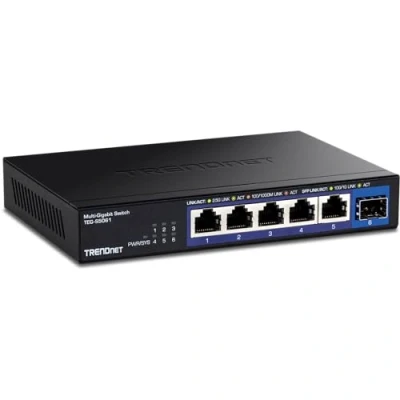 DEVICE INTERFACE: 5 x 2.5GBASE-T ports (100Mbps/1Gbps/ 2.5Gbps); 1 x 10G SFP+ slot (1Gbps / 10Gbps); LED indicators 2.5G PORTS: The 6 Port network switch is equipped with 2.5GBASE-T RJ-45 ports that provide higher gigabit speeds capable of up to 2.5Gbps over existing Cat5e or better cabling. 10 GIGABIT SFP+ SLOT: A dedicated 10G SFP+ slot for high-speed network connections, providing a cost-effective solution in adding 10G link capability to an SMB network. SWITCHING CAPACITY: The unmanaged switch is equipped with a 45Gbps Switching Capacity COMPATABILITY: The 6 Port Ethernet switch is backwards compatible with 10/100/1000Mbps devices. WALL MOUNTABLE: The 2.5G unmanaged switch features a durable metal housing with a convenient wall mountable design for greater installation flexibility. FANLESS DESIGN: The fanless design lowers energy consumption and eliminates distracting operating noise. IEEE STANDARD: IEEE 802.3bz (2.5G) and IEEE 802.3ae (10G SFP+) Compliant TRENDnet LIFETIME PROTECTION: The TEG-S5061 6-Port Unmanaged 2.5G Switch is backed with Lifetime Manufacturer Protection NDAA / TAA compliant (U.S. and Canada only)