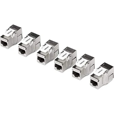 Product: 6-Pack of Cat6a tool-less keystone jacks Angle: 180° angle termination design Connection: Catch for steady connection to copper gigabit and 10G switches Compatibility: With Cat5e, Cat6 and Cat6a cabling Color-coded: Labelling for T568A and T568B wiring schemes