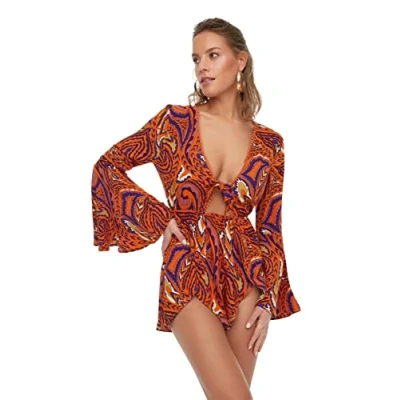 Material Composition: 100% Viscose Occasion: The Orange Regular fit Jumpsuit is perfect for Beachwear occasions. Our Collection offers affordable fashion for every occasion and style – from casual & relaxed to smart & elegant. Trendyol Collection translates the latest runway trends into wearable outfits for your wardrobe. Design: This Regular fit Woven Jumpsuit for Female has Crew neck Standard sleeve top and Wide leg bottom. It matches trends with Abstract pattern. If you are in between size,please size up. Wash at a maximum temperature of 30°C. Do not use bleach. Do not tumble dry. Do not iron. Do not dry clean.