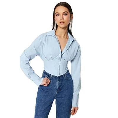 Trendyol FeMan Glam Fitted Basic Shirt Collar Woven Shirt,Blue,38
