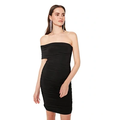 Material Composition: 96% Polyester, 4% Elastane Occasion: The Black Fitted Dress is perfect for Party occasions. Our Collection offers affordable fashion for every occasion and style – from casual & relaxed to smart & elegant. Trendyol Collection translates the latest runway trends into wearable outfits for your wardrobe. Design: It is a Carmen Collar Mini Dress for Female. This Knit Dress has a Bodycon design with Plain pattern. If you are in between size,please size up. Wash at a maximum temperature of 30°C. Do not use bleach. Do not tumble dry. Iron at low temperature. Do not dry clean.
