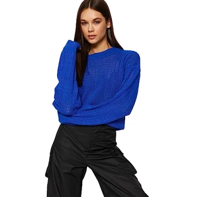Material Composition: 100% Acrylic Occasion: The Sax Oversize Sweater is perfect for Casual occasions. Our Collection offers affordable fashion for every occasion and style – from casual & relaxed to smart & elegant. Trendyol Collection translates the latest runway trends into wearable outfits for your wardrobe. Design: This Basic Knitwear Sweater for Female has Long sleeve Crew neck Ajouré pattern. It is Oversize fit. If you are in between size,please size up. Hand wash at a maximum temperature of 30°C. Do not use bleach. Do not tumble dry. Iron at low temperature. Do not dry clean.